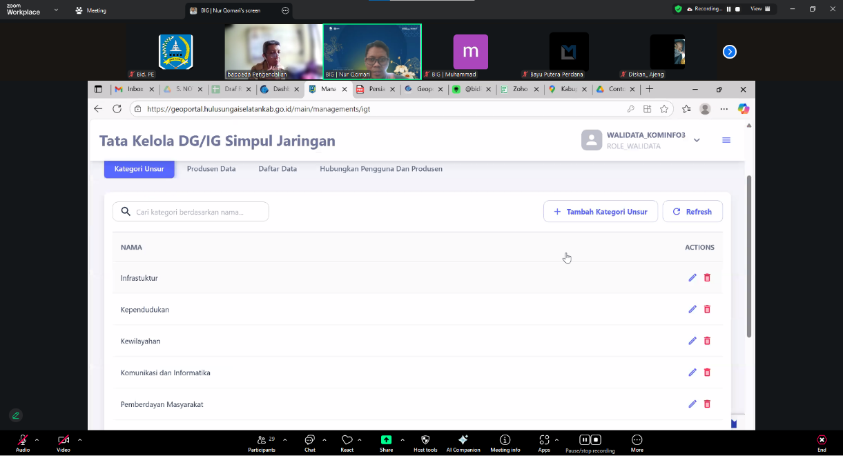 Selasa,14/10/2025 Acara dibuka oleh Kepala Bidang Pengendalian dan Evaluasi Bappelitbangda Kab. Hulu Sungai Selatan. Acara dihadiri oleh 21 Perangkat Daerah terkait yang ada di Kabupaten Hulu Sungai Selatan. Disampaikan Penjelasan mengenai peran dan fungsi dari User Admin, Walidata, dan Produsen Data dalam sistem Geoportal.